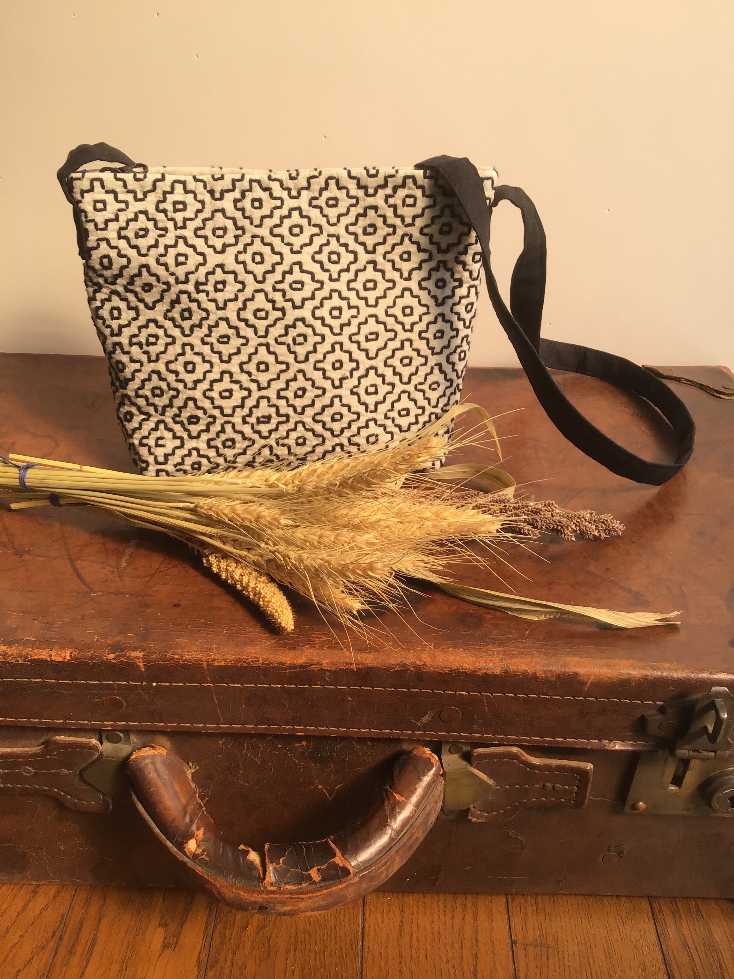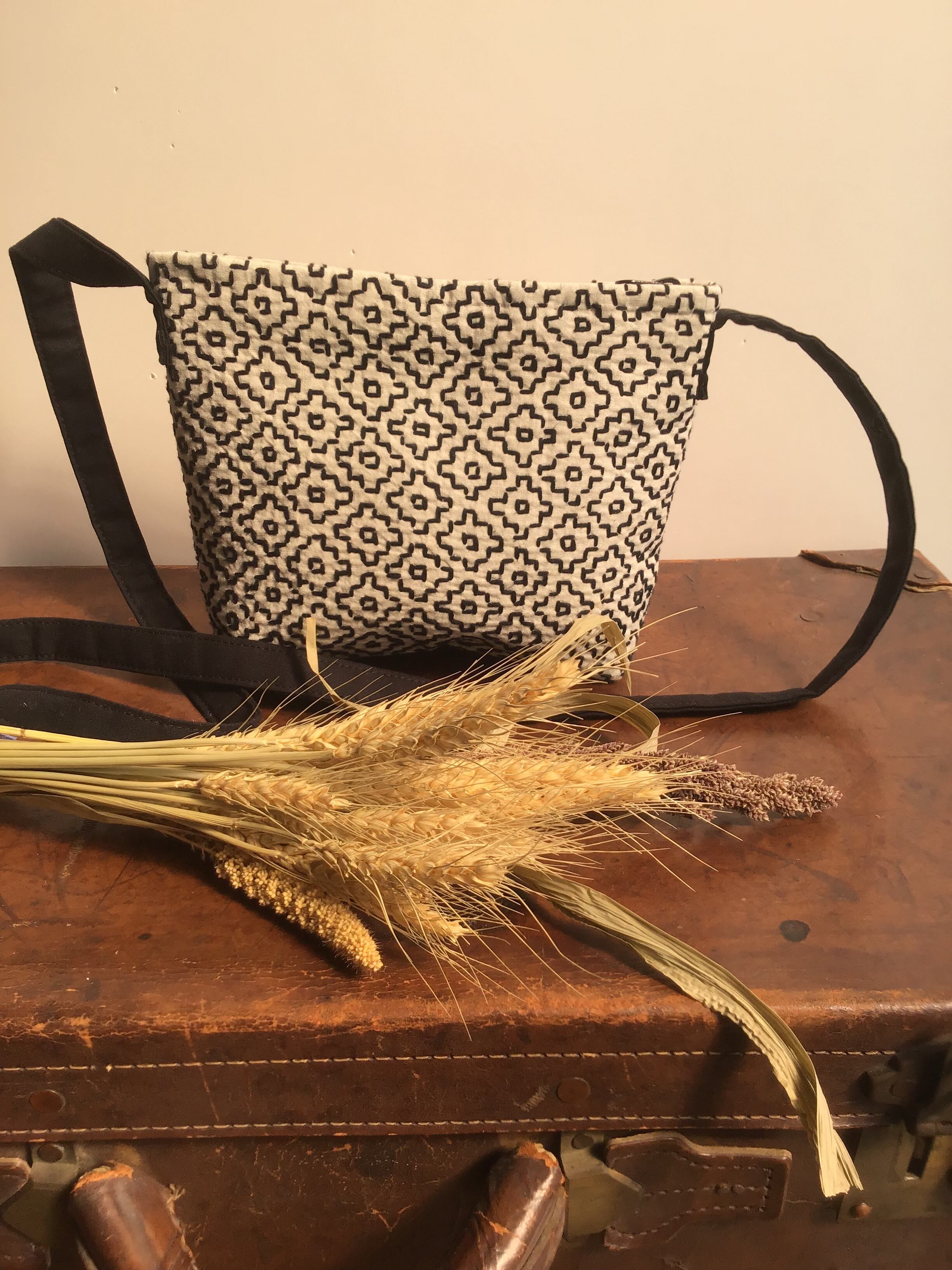 刺し子ショルダーポーチ シロ ×クロ 柿の花刺