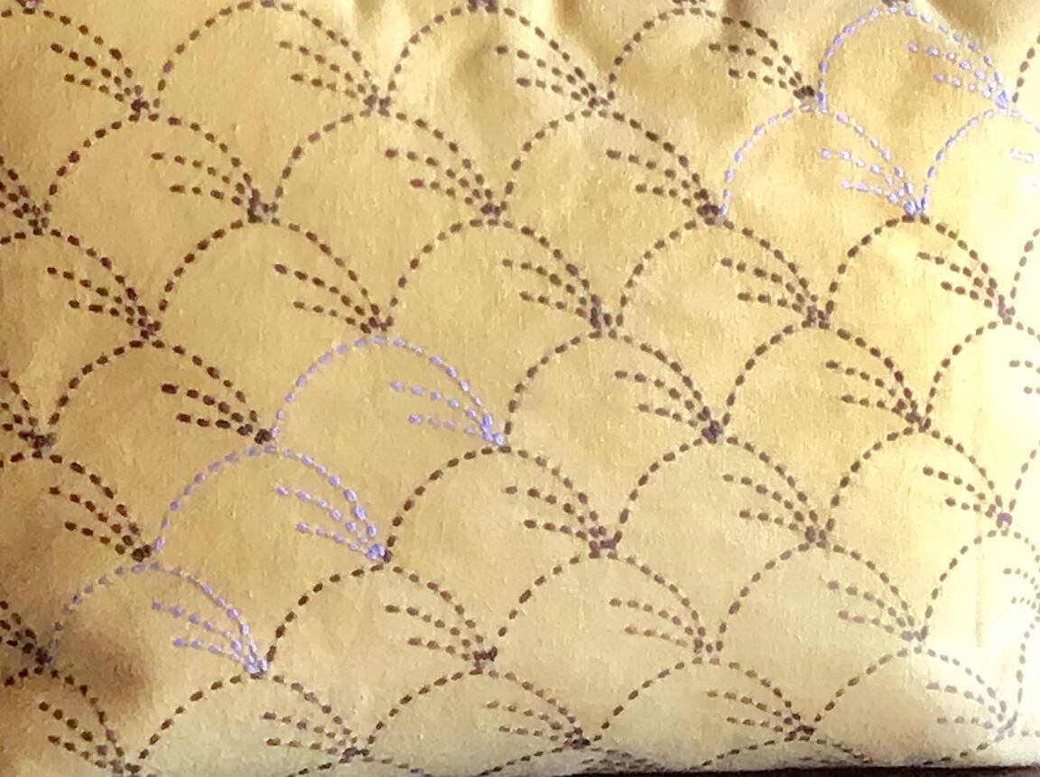 少し麻の入った綿の黄色の布に、茶色の糸で野分模様を刺してあります。